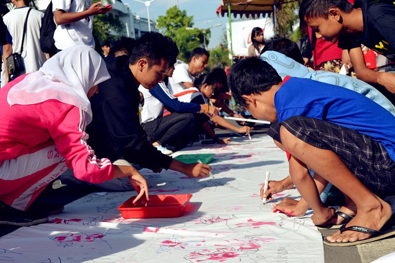 menulis pada kain putih ini, dan menempelkan bekas cap tangan berwarna merah menandakan, bahwa ikut mendukung STOP KEKERASAN TERHADAP ANAK serta SEKOLAH RAMAH ANAK YESSSSS !!!!